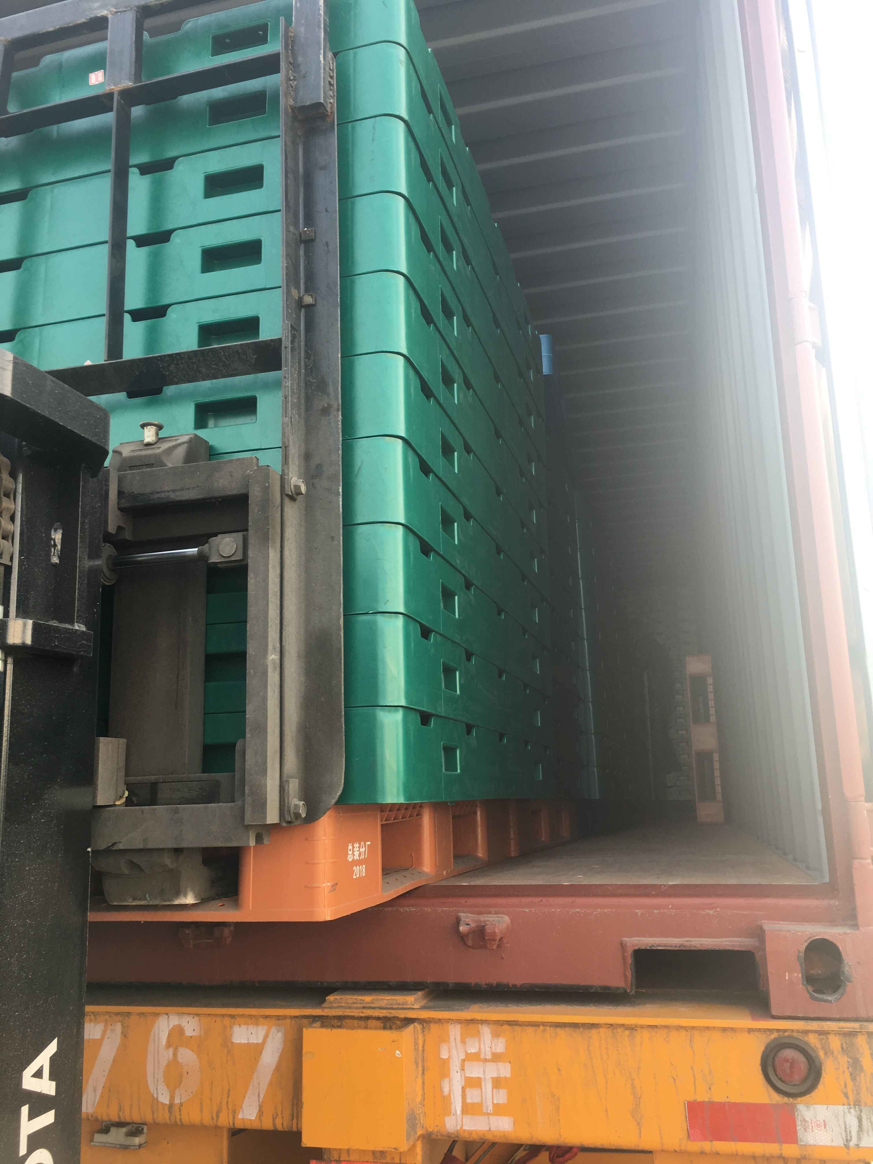 Palés de plástico especialmente diseñados para el transporte de botellas de agua de 5 galones (~19L). 1360x1095x127.5mm (~54"x44"x5.2") | ||